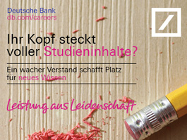 weiterlesenBei der Deutschen Bank steht die Förderung ambitionierter Talente hoch im Kurs. Denn sie sind es, die die Zukunft gestalten – auch die unserer Bank. Indem sie die Innovationskraft von morgen sichern und den Wandel vorantreiben. Indem sie über den Tellerrand schauen und unseren Leistungsanspruch teilen. Mit der neuen Seminarreihe „Skills4work“ bieten wir Studierenden ab dem dritten Fachsemester die Chance, ihre Persönlichkeit weiterzuentwickeln und sich so einen Vorsprung zu verschaffen. ...
