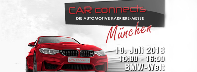 weiterlesenDu willst die Automobilindustrie aufmischen, deine Ideen einbringen und die Autos der Zukunft mitgestalten? Dann bist du bei uns genau richtig! Besuche uns am 10. Juli 2018 in der BMW-Welt-München! Die CAR-connects ist eine der bedeutendsten Karrieremessen für die Automobilindustrie und somit dein Sprungbrett für eine Karriere bei namenhaften Unternehmen. Die Messe richtet sich gezielt an Studierende, Absolventen und (Young-) Professionals, die ihre Zukunft im Automotive-Bereich sehen! Wir erwarten dich ...