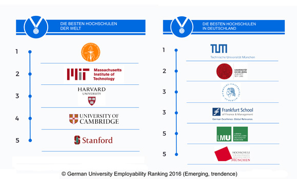 weiterlesenUniversity Employability Ranking von Emerging und trendence erschienen + Arbeitgeber wählen Hochschulen mit den besten Absolventen + Deutsche Hochschulen überholen britische Universitäten + Ranking ist wichtige Entscheidungshilfe für Studierende bei der Wahl der Hochschule + Erste Ergebnisse in Times Higher Education und DIE ZEIT Die Technische Universität München und die Uni Heidelberg haben nach Meinung der deutschen Arbeitgeber die besten Absolventen – und zwar nicht nur gemessen an ihrem Fachwissen, ...
