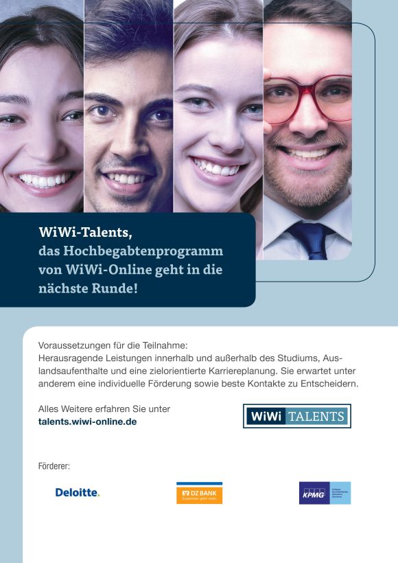 weiterlesenLiebe Studierenden, liebe AbsolventInnen, liebe DoktorandInnen, auch in diesem Semester suchen wir von WiWi wieder gemeinsam mit unseren Partnern von KPMG, Deloitte und DZ Bank die vielversprechendsten Talente! WiWis Wanted: Studierende mit besonders herausragenden Leistungen können sich noch bis zum 15. November 2015 um die Aufnahme ins WiWi-Talents-Programm bewerben! Überzeugt unsere fachkundige Jury mit eurem Lebenslauf, euren Studienleistungen, Praxis- und Auslandserfahrungen sowie eurem sozialen und gesellschaftlichen Engagement! Die Mühe lohnt ...