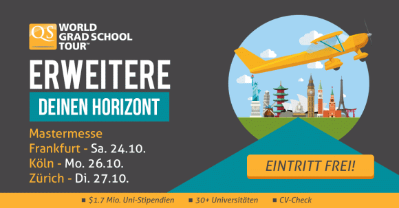 weiterlesenWer seine Karriere noch auf die nächste Stufen bringen möchte, stellt sich nach dem Bachelor oder spätestens nach mehreren Jahren Berufserfahrung die Frage eines weiterführenden Studiums. Doch welcher Master passt zu den eigenen Karriereplänen und wie findet man die passende Universität? Hilfe und ausgiebige Beratung bei der Studienwahl bietet nun die kommende Master-Messe in Frankfurt (24.10.), Köln (26.10.) und Zürich (27.10.). Denn dort sind ...